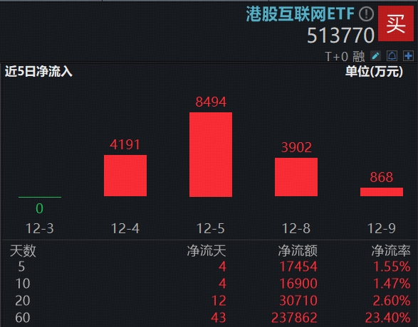 值得注意的是,已有巨量资金持续抢筹相关标的。上交所数据显示,港股AI核心工具——港股互联网ETF(513770)连续4日吸金,合计获资金净流入1.75亿元。