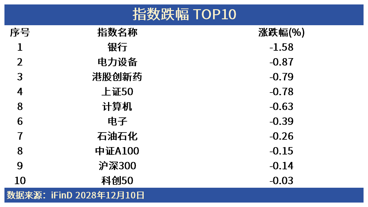 截至2025年12月10日A股收盘,银行回调1.58%,招商银行、农业银行跌幅居前。港股创新药回调0.79%,再鼎医药、康哲药业跌幅居前。
