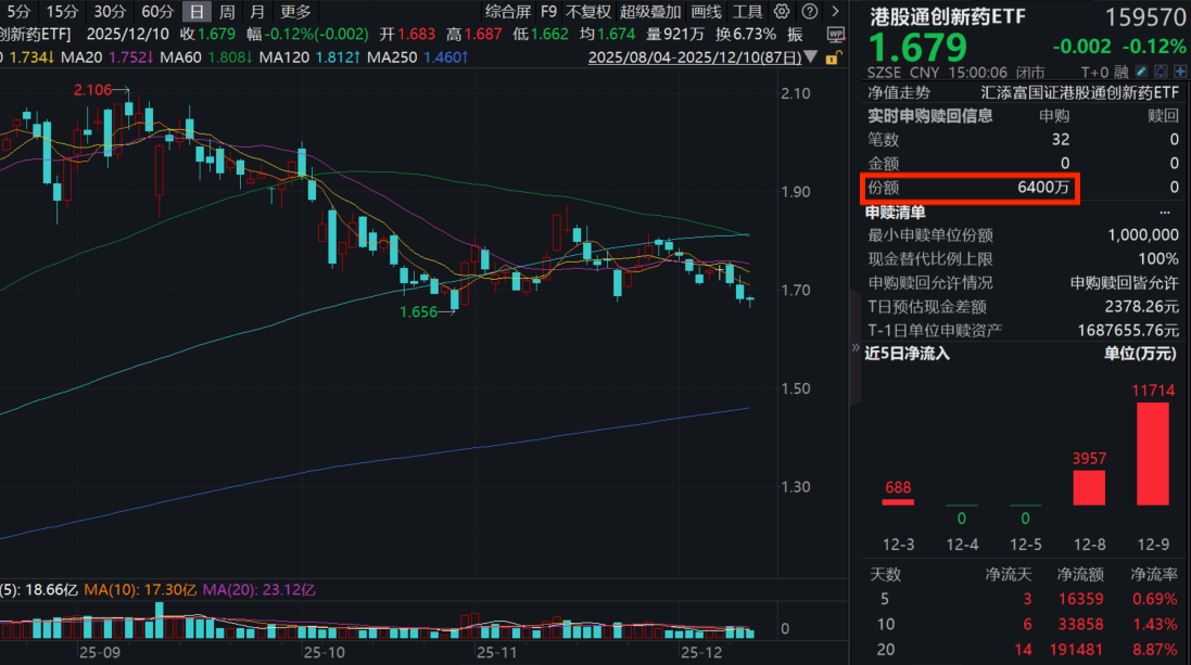 今日(12.10),港药探底回升,创新药纯度100%的港股通创新药ETF(159570)微跌0.12%,全天成交额超15亿元!资金面上,昨日净流入超1.1亿元,今日再获超1亿元净流入,近20日累计“吸金”超19亿元!截至12月9日,港股通创新药ETF(159570)最新规模超230亿元,同类持续领先!