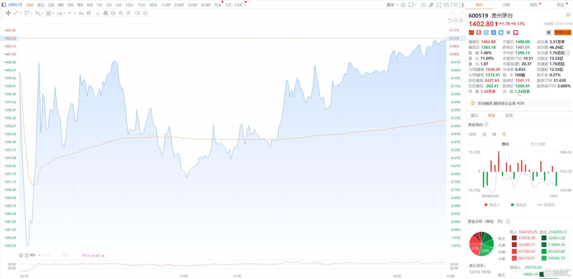 截至今日收盘,茅台股价收涨0.13%报1402.8元,总市值1.76万亿元。