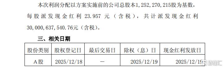 公司宣布将以总股本12.52亿股为基数,每股派发23.957元现金红利(含税),共计派发300.01亿元(含税)。