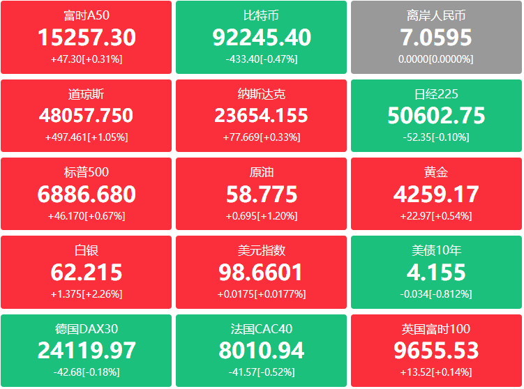 期货:现货黄金涨0.46%报4227.37美元,黄金期货涨0.50%报4257.20美元;现货白银涨1.83%报61.7854美元,白银期货涨2.27%报62.230美元;铜期货涨1.64%报5.4070美元,现货铂金跌1.84%,现货钯金涨0.82%;原油期货报58.46美元,布伦特原油报62.21美元,天然气期货报4.5950美元,汽油期货报1.7815美元,取暖油期货收报2.2730美元。