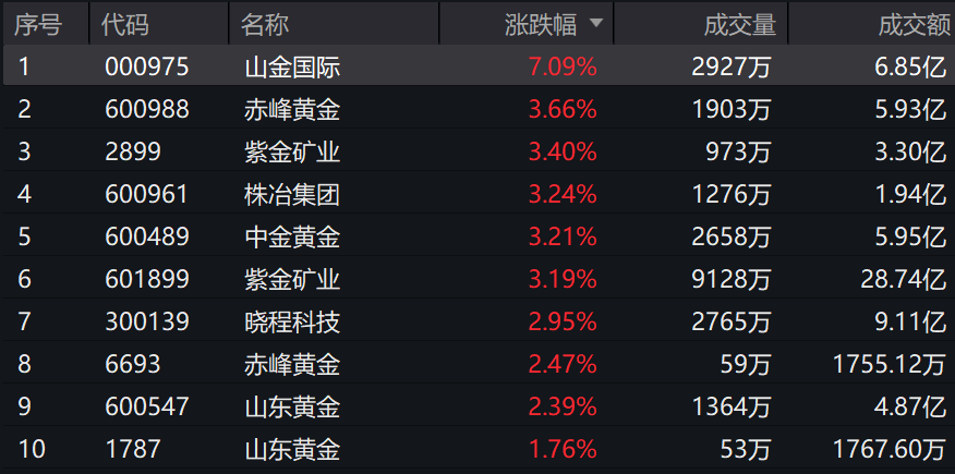 截至2025年12月11日 09:57,中证沪深港黄金产业股票指数(931238)强势上涨1.80%,成分股山金国际(000975)领涨,赤峰黄金(600988)、株冶集团(600961)、紫金矿业(02899)、紫金矿业(601899)等个股跟涨。