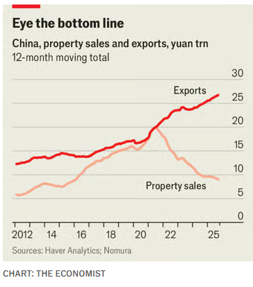 不过,中国的顺差并不只是出口企业韧性的体现,也反映出国内支出疲弱。今年前11个月,中国进口以美元计同比下降。Absolute Strategy Research的亚当·沃尔夫指出,中国的投资支出正在放缓,尤其是建筑领域,而这正是进口最密集的行业之一。自2021年新房销售达到高点以来,新房销量已下降一半,而同期出口却增长了三分之一。