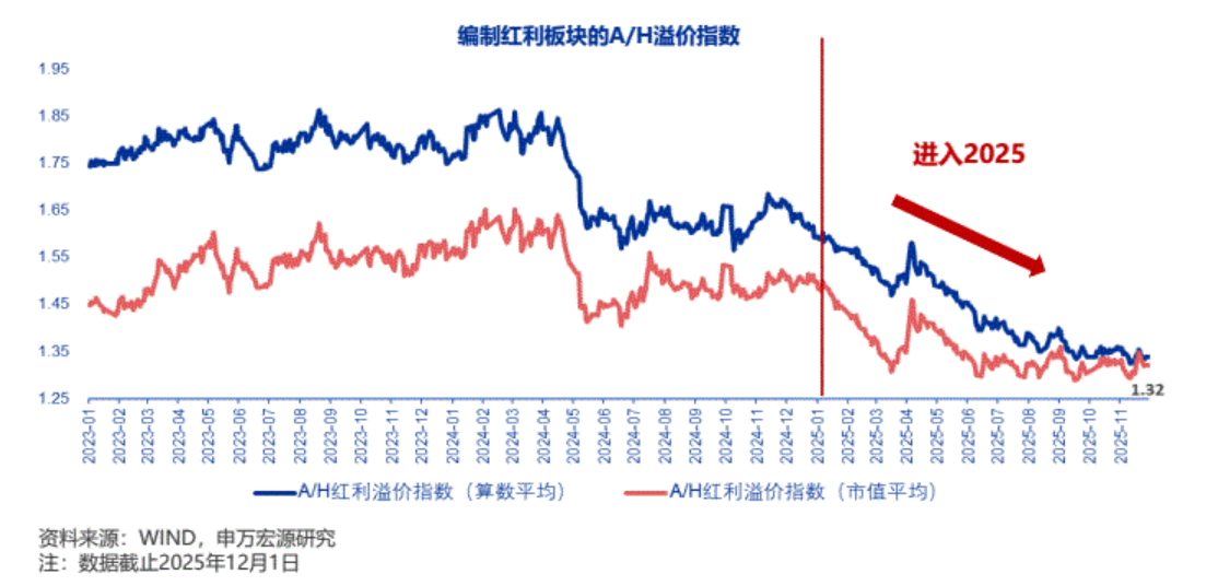 2025上半年,港股红利板块超额明显。申万宏源选择A&H两地上市的红利类公司(A股股息>3%、H股股息>3.5%),编制A&H红利价差指数:按市值加权,A股红利板块溢价从2025年初的49.9%下降至12月1日的32.4%。考虑20%的红利税,目前港股红利板块比A股整体便宜5-6%
