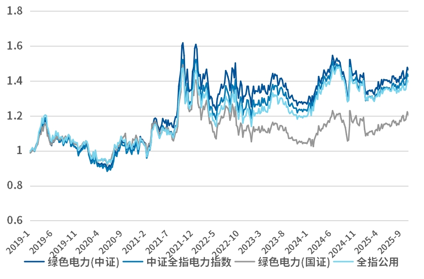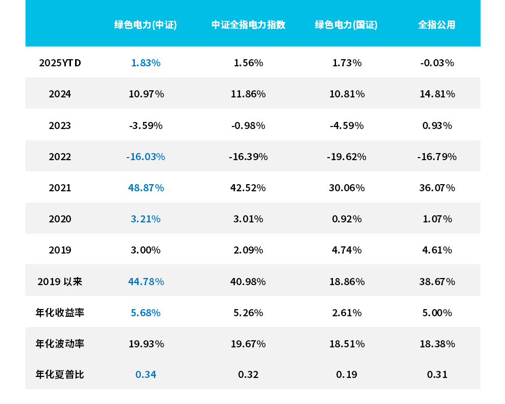 从风险收益特征上看,中证绿色电力指数2019年以来年化夏普比0.34,单位风险收益较中证全指电力指数等电力指数更为理想。