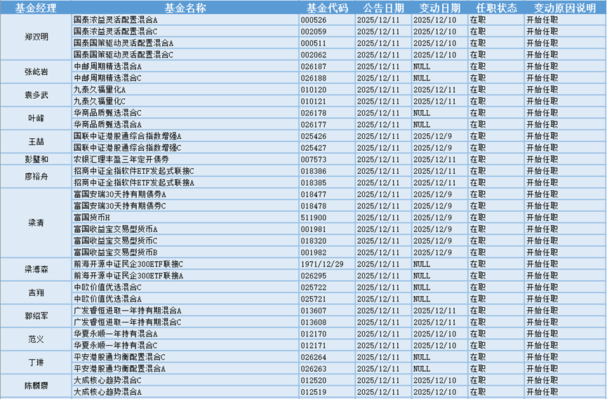 基金经理是一只基金产品最核心的成员,能决定一只基金的投资方向、投资策略以及投资风格,基金经理出色的择时选股能力和调研预测能力是基金业绩的有力保证,所以基金经理是投资者在选择基金产品时的重要依据。基金经理的变动很大程度上会影响到基金产品未来的表现,是一个需要特别关注的信息。12月11日共有23位基金经理发生任职变动。