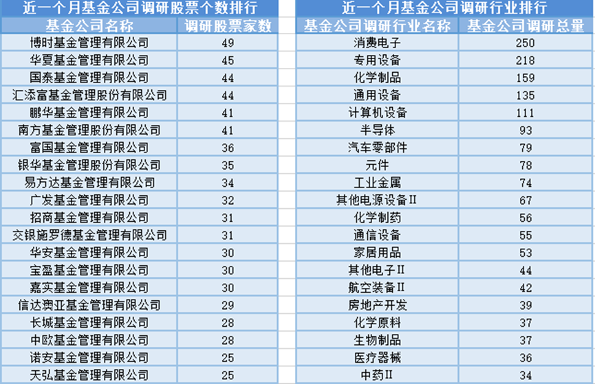 近一个月(11月11日-12月11日),博时基金参与公司调研的数量最多,共调研49家上市公司,此外调研较为活跃的还有华夏基金、国泰基金和汇添富基金,分别调研45家、44家、44家上市公司;从调研行业上来看,基金公司对消费电子行业的上市公司调研次数最多,共有250次,其次是专用设备行业,基金公司调研了218次。