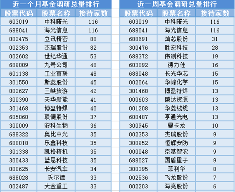 从个股调研情况上来看,最近1个月(11月11日-12月11日)最受公募基金关注的是中科曙光,中科曙光属于专用计算机设备行业,主营业务为高端计算机、存储、安全、数据中心产品的研发及制造,同时大力发展数字基础设施建设、智能计算等业务。共有116家基金管理公司参与调研,其次是海光信息和立讯精密,分别接受116家、88家基金管理公司的调研。