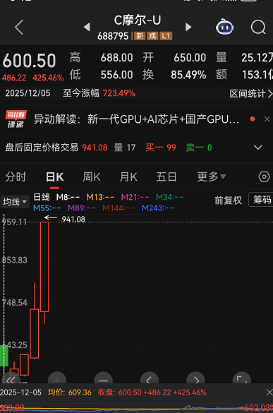 12月5日,摩尔线程正式登陆科创板,开盘即报650元/股,相较114.28元/股的发行价大涨468%,盘中最高上涨502.03%,报688元/股;截至收盘摩尔线程报600.5元/股,上涨425.46%,全天成交153.1亿元。