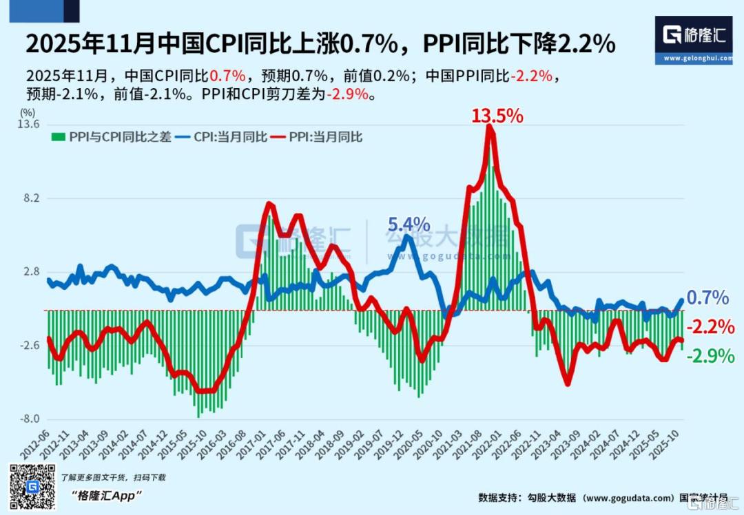 统计局11月的宏观数据显示,11月CPI同比上涨0.7%,上月为上涨0.2%,1-11月CPI累计同比为0.0%;11月PPI同比下降2.2%,上月为下降2.1%,1-11月PPI累计同比下降2.7%。