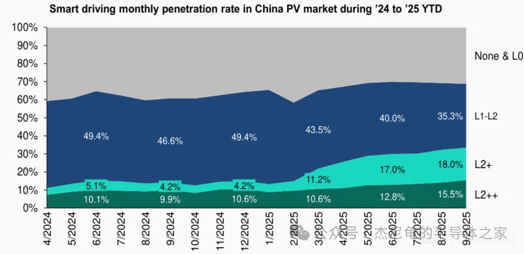 但 2025 年,在以比亚迪为首的 “智驾平权” 将高速 NOA 下沉到 10-20 万元级别的平价车型中;以华为和新势力为首的 “智驾引领” 梯队则加速普及高阶的城市 NOA,L2 及以上 9 月达到了 33.5%,智驾渗透率正在加速提升。