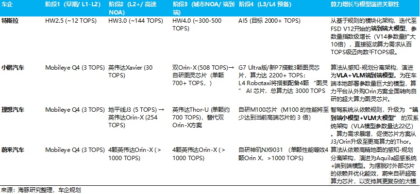 从头部车企的规划来看:特斯拉 FSD V14 参数量(今年 10 月推送)相比 V13 扩大了 10 倍,其规划的 AI5 芯片算力也高达 2000-2500 TOPS,是当前 HW4.0 算力的 5 倍(计划于 2026 年底投产)。