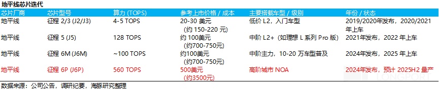 从地平线芯片的迭代来看,地平线用于城市 NOA 智驾的 J6P 芯片约 500 美元,是用于高速 NOA 智驾 J5 和 J6M 售价的 5 倍,更远高于地平线初代用于 L1-L2 低级智驾的 J2/J3 芯片售价。