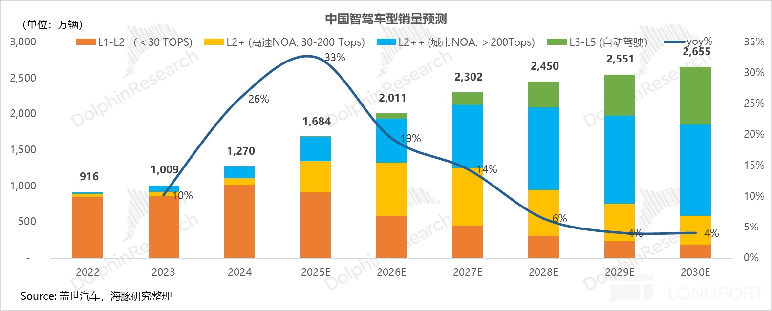 从销量维度来看:2024 年中国乘用车销量 2310 万辆,智驾渗透率 55%。海豚君预测到 2030 年,智能驾驶渗透率将达 100%,其中 L2 及以上渗透率达 93%(对应约 2655 万辆智驾车辆)。