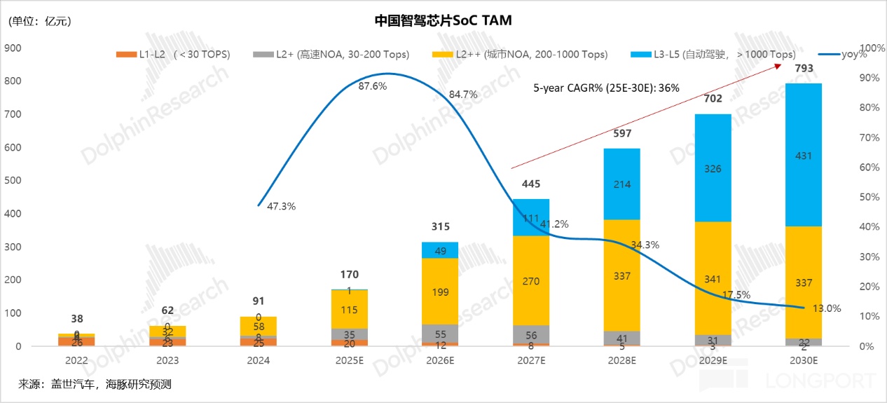 正是因为智驾芯片的 “量价齐升” 逻辑,海豚君测算 2025-2030 年市场规模 CAGR 将达到 36%,至 793 亿元。其中单车芯片价值 5 年 CAGR 为 24%, 智驾车型销量 5 年 CAGR 为 10%。