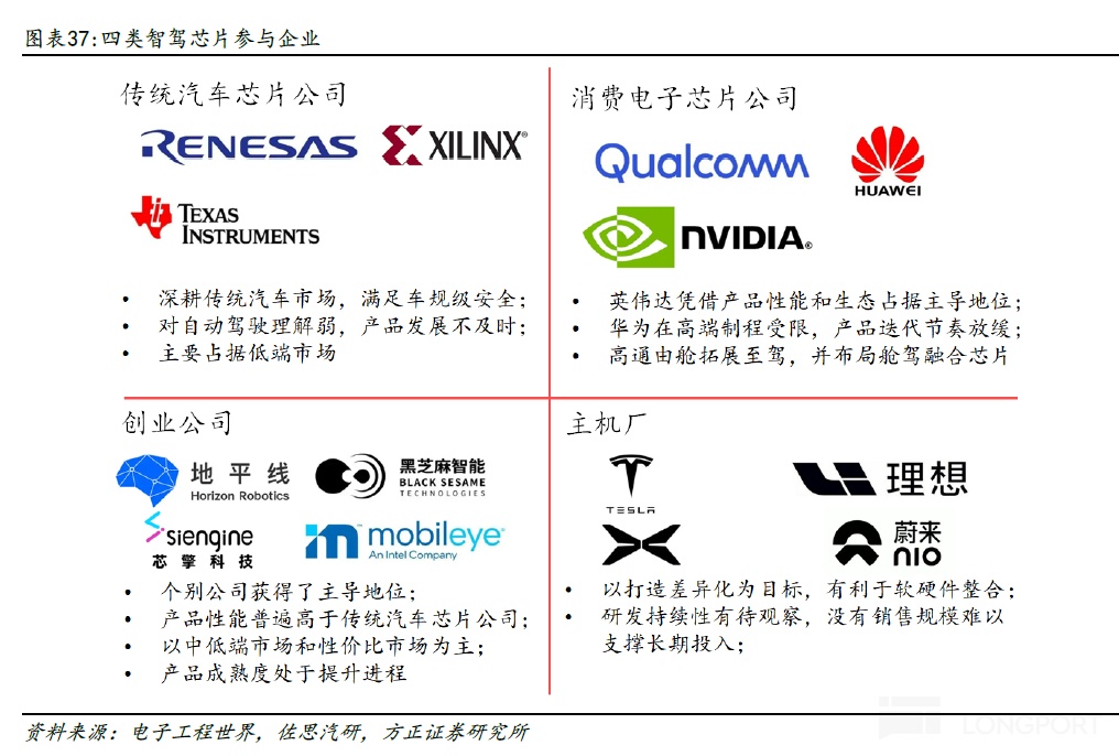 ① 垂直一体化玩家:特斯拉和华为。特斯拉采用自研自用的垂直整合模式,很早就自研芯片,华为也为 “智选车” “HI 模式” 下的车企提供软硬一体化的智驾方案。