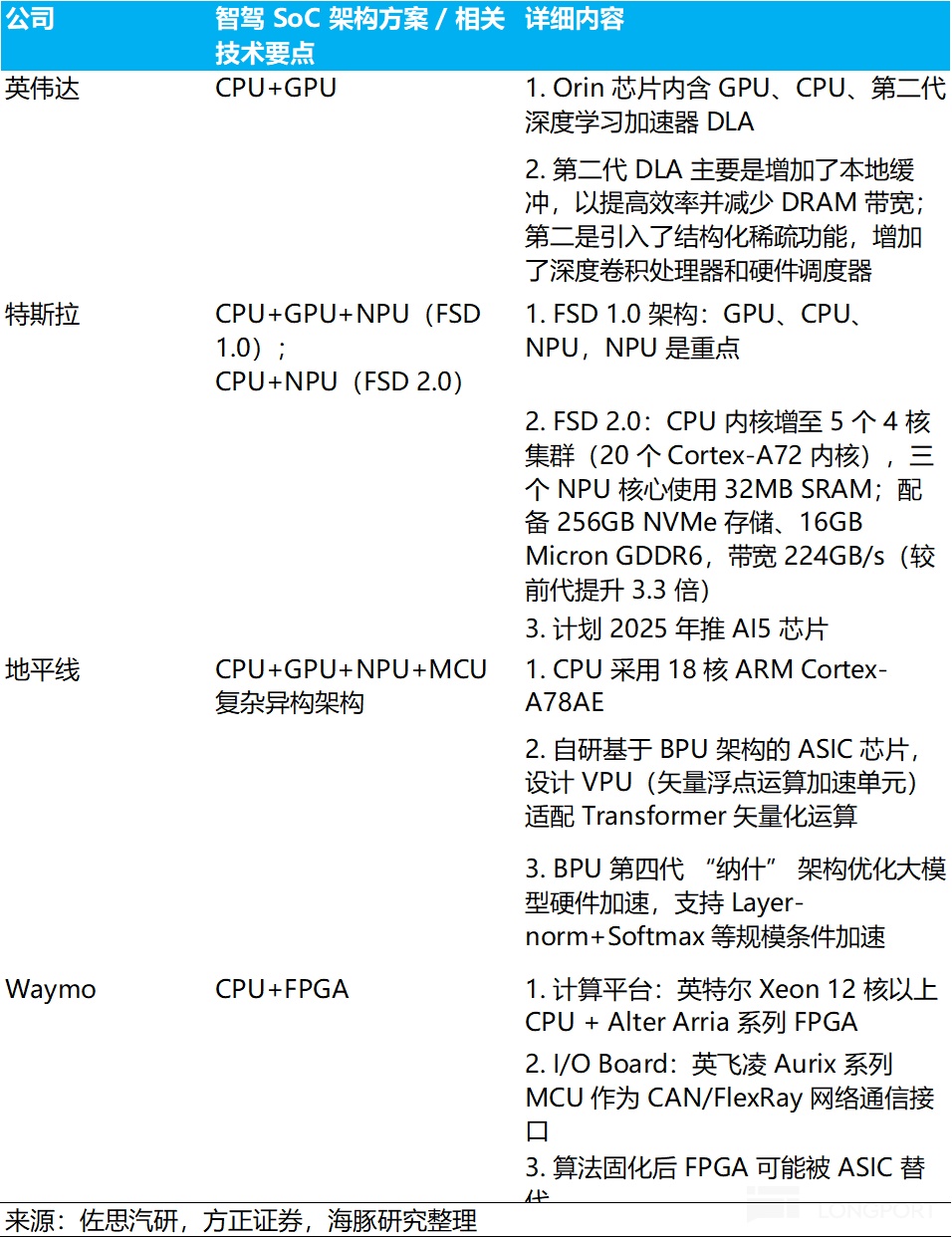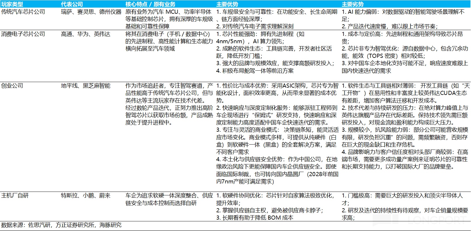 ④ 主机厂自研:特斯拉、小鹏汽车、蔚来汽车等。主机厂追求软硬一体化深度整合,掌握供应链自主权以及降低 BOM 成本,同时可将智驾芯片扩展至具身智能上。但自研芯片门槛高,对车企的销量规模,人才储备和资金投入要求都很苛刻,不是谁都能做。