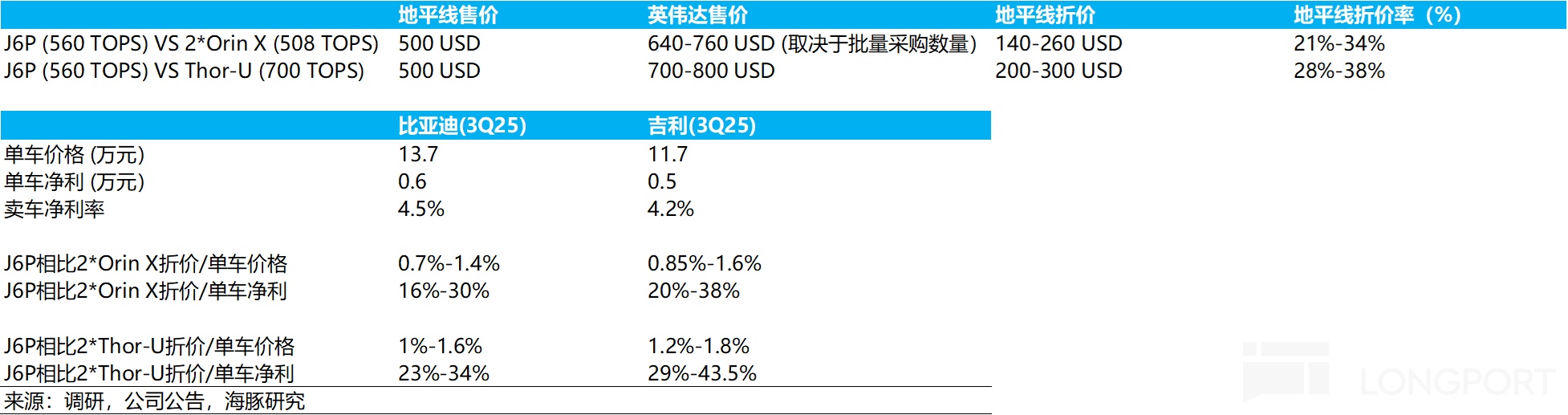 这有助于比亚迪和吉利这种规模大、低毛利的车企,采用地平线 J6P 芯片能能加速城市 NOA 在平价车型上的渗透。
