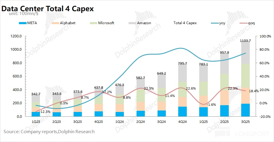 结合各家大厂情况,海豚君预计四大核心云厂商(谷歌、Meta、微软和亚马逊)的合计资本开支在 2026 年有望接近 6000 亿美元左右,同比增长 40%,这为明年 AI 芯片市场需求的增长提供了保障。