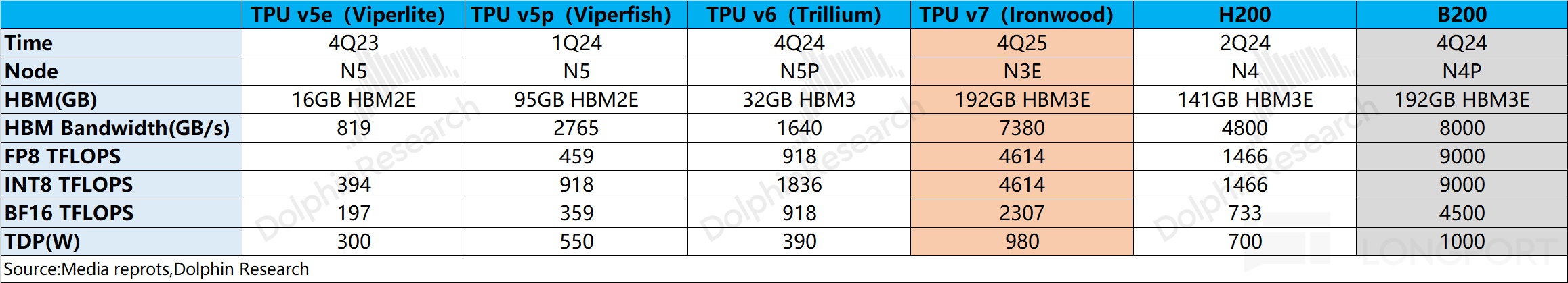 c)“谷歌 Gemini 博通” 竞争力的提升:一方面谷歌近期开始量产的 TPUv7 在性能上已经超过了 H200,部分指标也开始向英伟达的 B200 产品靠近另一方面谷歌自身的 Gemini 大模型表现并不逊色于依托英伟达的 GPT 表现