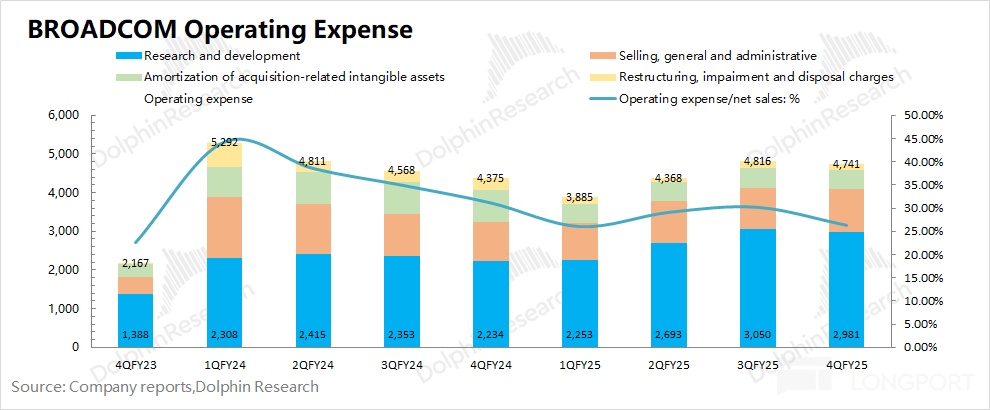 博通 BROADCOM (AVGO.O) 在 2025 财年第四季度的经营费用为 47.4 亿美元,环比略有回落。