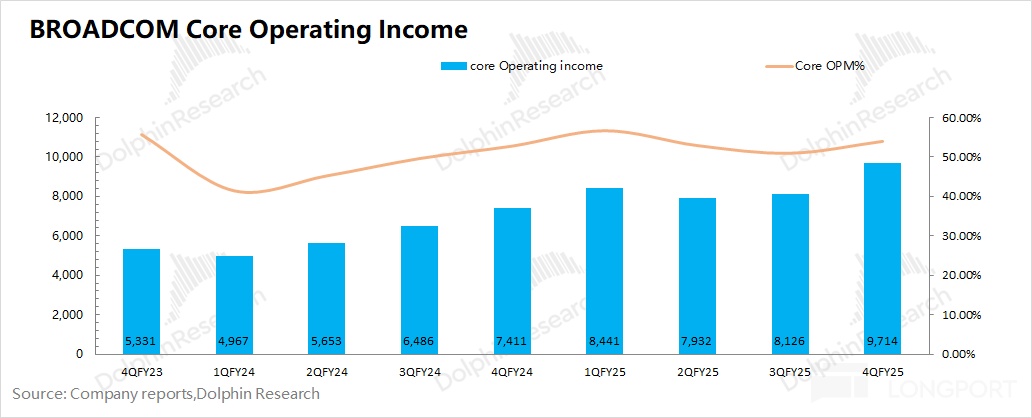 相比于净利润,海豚君认为核心经营利润(=毛利润 - 研发费用 - 销售及管理费用)更能反应公司真实的经营情况。博通 AVGO 本季度实现核心经营利润 97 亿美元,环比增加 16 亿美元,主要来自于 AI 业务增长的带动。