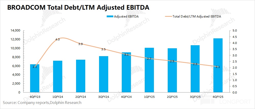 由于博通擅长外延并购,公司通常把调整后 EBITDA% 作为公司的经营面指标之一。而海豚君测算公司 2025 财年第四季度的调整后 EBITDA% 回升至 67.8%,好于公司此前指引(67%)。