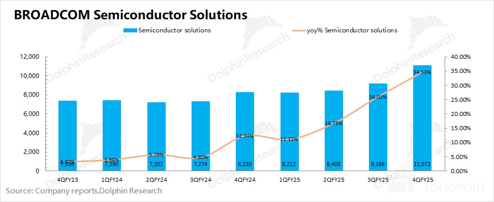 博通 BROADCOM (AVGO.O) 在 2025 财年第四季度的半导体解决方案实现营收 110.7 亿美元,同比增长 34.5%。公司半导体业务本季度的增长主要来自于 AI 业务的带动,非 AI 业务保持平稳。