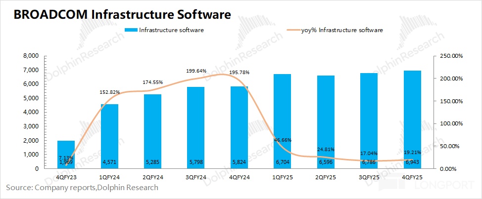 博通 BROADCOM (AVGO.O) 在 2025 财年第四季度的基础设施软件实现营收 69.4 亿美元,同比增长 19%。增长主要来自于 VMware 的并购整合和收费模式调整(从永久许可证模式全面转向于订阅模式)。