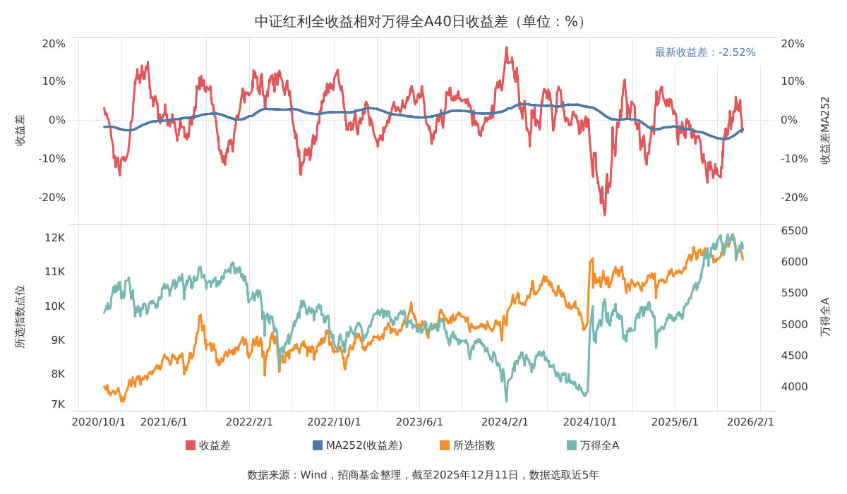 值得关注的是,二级市场上,近期红利板块随大市调整,中证红利全收益相对万得全A40日收益差再度跌破零轴,或意味着短期红利资产布局机会再现。