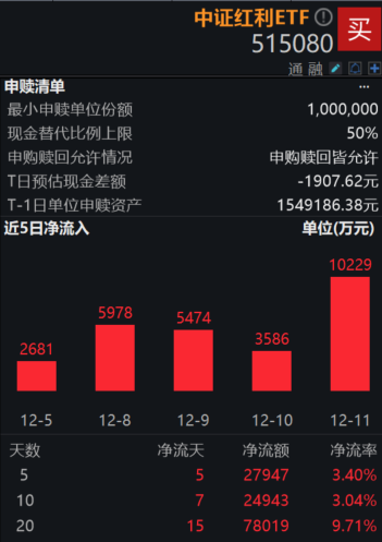从资金面上看亦是如此,上交所数据显示,中证红利ETF(515080)昨日获1.02亿元资金大额净流入,近5个交易日累计净申购额达2.8亿元。