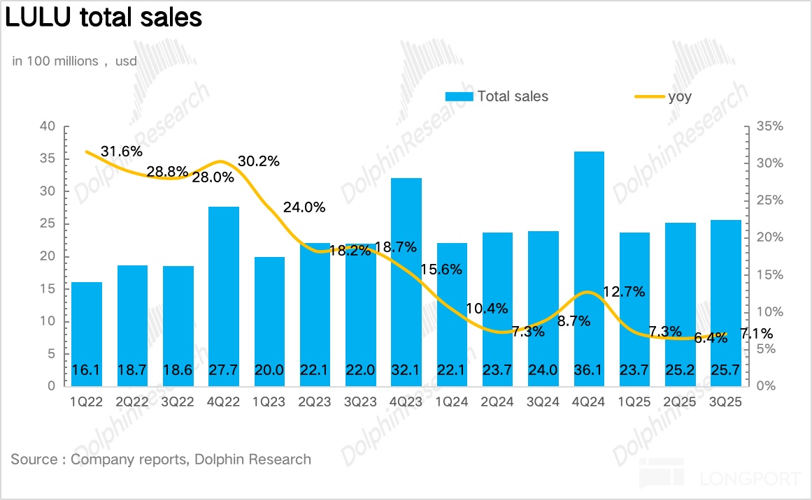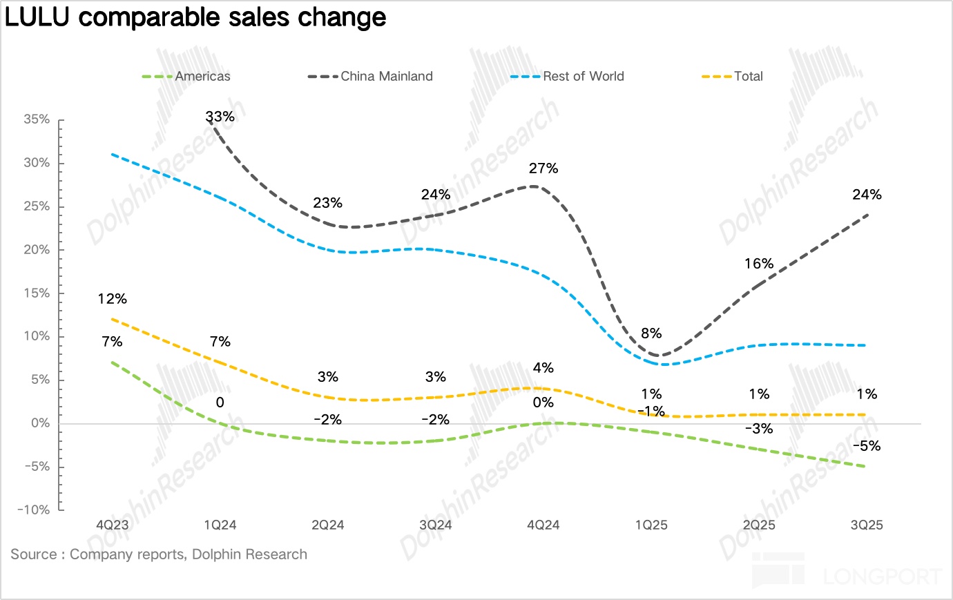 3Q25Lululemon 实现营收 25.7 亿美元,同比增长 7.1%。由于国际市场的强劲增长,公司总体业绩增速并没有出现上个季度指引的进一步下滑(指引为 3%-4%),趋势上和前两个季度增速持平,属于中规中矩的表现。