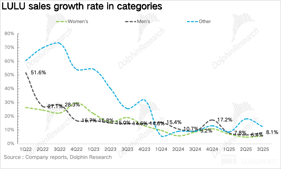 3、推新速度明显改善。从品类上看,核心主业女装实现营收 16.5 亿美元,同比增长 5.7%,略高于市场预期,海豚君推测Lululemon 在年初经过组织架构的调整,设计和商品部门协同性提升后在推新节奏明显改善,新品的贡献超出预期。男装实现营收 6 亿美元,同比增长 8.1%,趋势上看环比前两个季度略有提速,但并不明显。