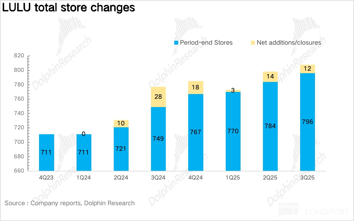 截至 3Q25,公司全球门店总数达 796 家,环比净新增 12 家。结合公司去年年底对 2025 年的开店规划,计划全球新开 40-45 家,目前整体开店节奏相对稳定。