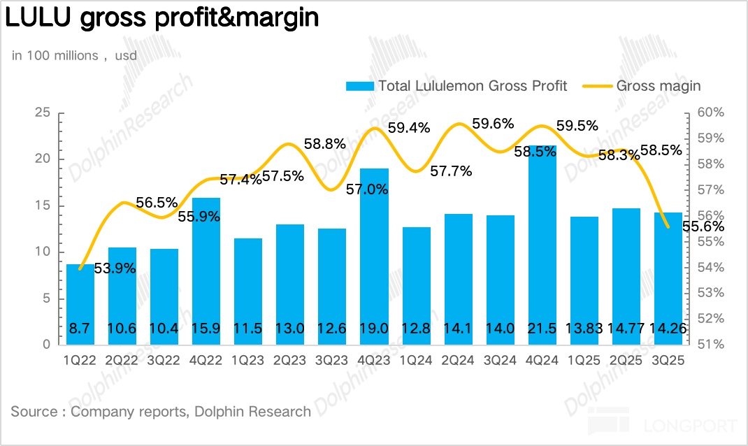 1、营收超出市场一致预期。3Q25Lululemon 实现营收 25.7 亿美元,同比增长 7.1%,由于国际市场的强劲增长,公司总体业绩增速并没有出现上个季度指引的进一步下滑(指引为 3%-4%),趋势上和前两个季度增速持平。