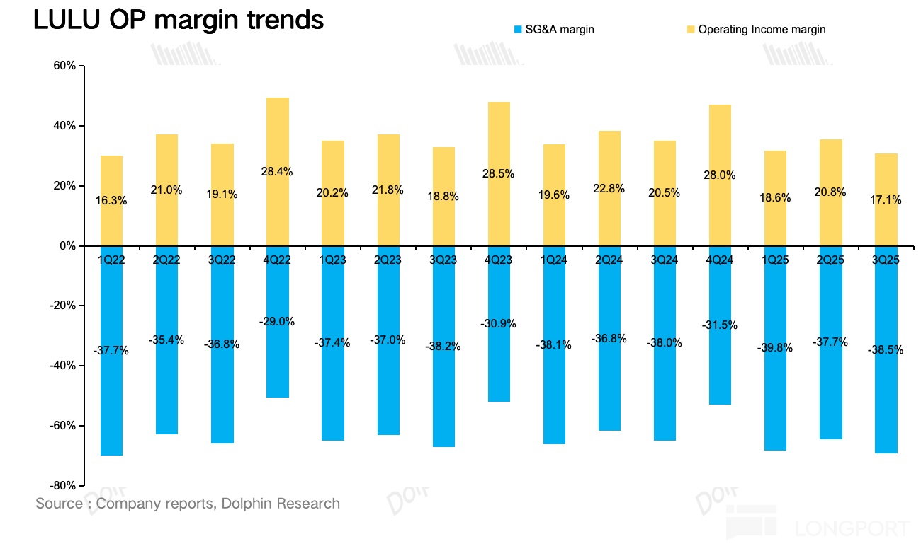 3Q25 男装实现营收 6 亿美元,同比增长 8.1%,占整体业务比例较去年同期几乎没变化。从近期的动作上看,产品方面,Lululemon 针对男性用户 “怕出汗显痕迹” 的痛点,推出了 ShowZero 系列 Polo 衫,主打外侧无汗渍,切入男性商务休闲和高尔夫场景,并对核心的 Metal Vent Tech(高性能训练)和 Zeroed In(轻量速干)系列进行迭代,进一步改善透气性和舒适度。但整体上,目前男装仍处于从依赖经典款向新品驱动转型的过渡期,结合公司电话会信息,Lululemon 要在 2026 年春节期间把新品占比从当前 23% 提升到 35% 左右。