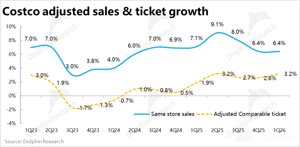 本后核心原因同样是,美国地区的同店客流增速从上季的 3.5% 再度明显走低到 2.6%,连续两个季度幅度不小的放缓,很难不让人怀疑 Costco 在美国地区的客群消费能力确实在走弱。类似的,加拿大增长坚韧背后也是因其同店客流仍保持着 5% 的稳健增长。