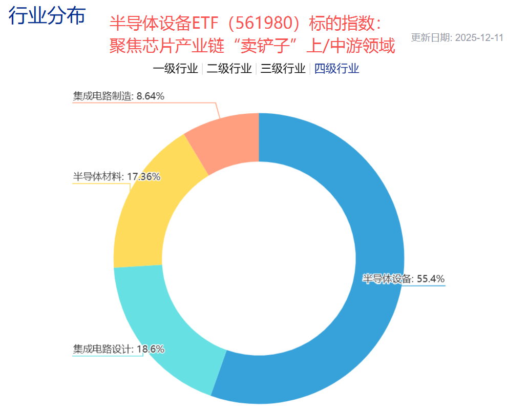 中证指数官网数据显示,半导体设备ETF(561980)跟踪中证半导,标的指数中半导体设备 材料 集成电路设计三行业占比超9成,均为国产替代的关键领域。从重仓股来看,指数重点布局中微公司、北方华创、寒武纪、中芯国际、海光信息等产业龙头,指数年内涨幅为55.56%、区间最大上涨超80%,在中华半导体芯片、国证芯片、芯片产业等主流半导体指数中位列第一,弹性突出。