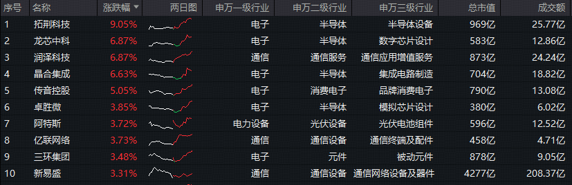 成分股方面,拓荆科技领涨超9%,龙芯中科、润泽科技、晶合集成涨逾6%,传音控股、卓胜微、阿特斯、亿联网络等个股大幅跟涨。光模块龙头新易盛涨逾3%。
