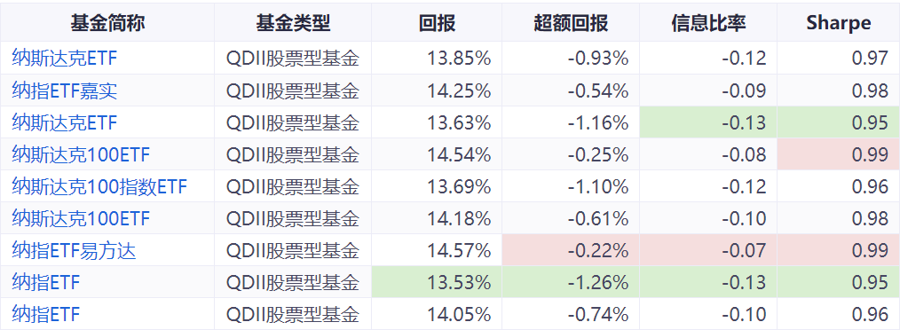 其中,易方达纳斯达克100ETF(159696)的回报高达14.57%,超越同类ETF产品,展现出较强的市场捕捉能力。其信息比率和Sortino比率分别为-0.07和1.64,显示了良好的风险调整后收益。
