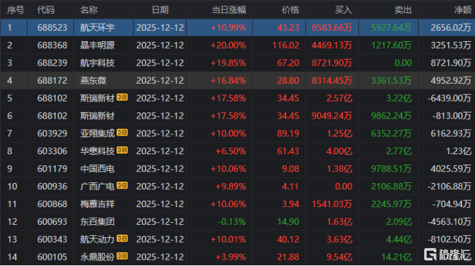 龙虎榜中涉及机构专用席位的个股中,当日净卖出额前三为航宇科技、西部材料、顺灏股份,分别为2.15亿元、1.08亿元、8017.03万元。
