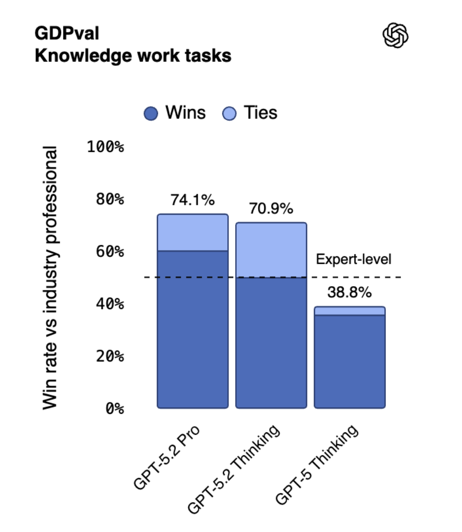 OpenAI介绍称,GPT‑5.2被定位为“专业知识工作的最优解”,在多项核心能力上实现跨越式突破,其中GPT-5.2 Thinking版本更成为公司首款在真实世界软件工程任务中达到人类专家水平的AI模型。