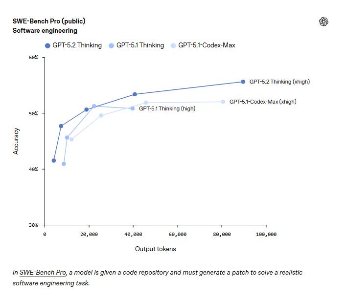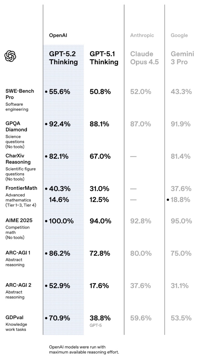 横向对比显示,GPT-5.2 Thinking在几乎所有关键推理基准上均小幅领先Google Gemini 3和Anthropic Claude Opus 4.5,无论是在真实软件工程、高阶科学问答,还是抽象模式发现任务中均保持优势。