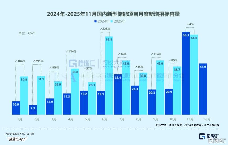 从最新招标数据来看,2025年1-11月,国内新型储能新增招标规模已突破400GWh,较之去年同比增长75%。高增长趋势背后,储能行业拐点已经浮现。