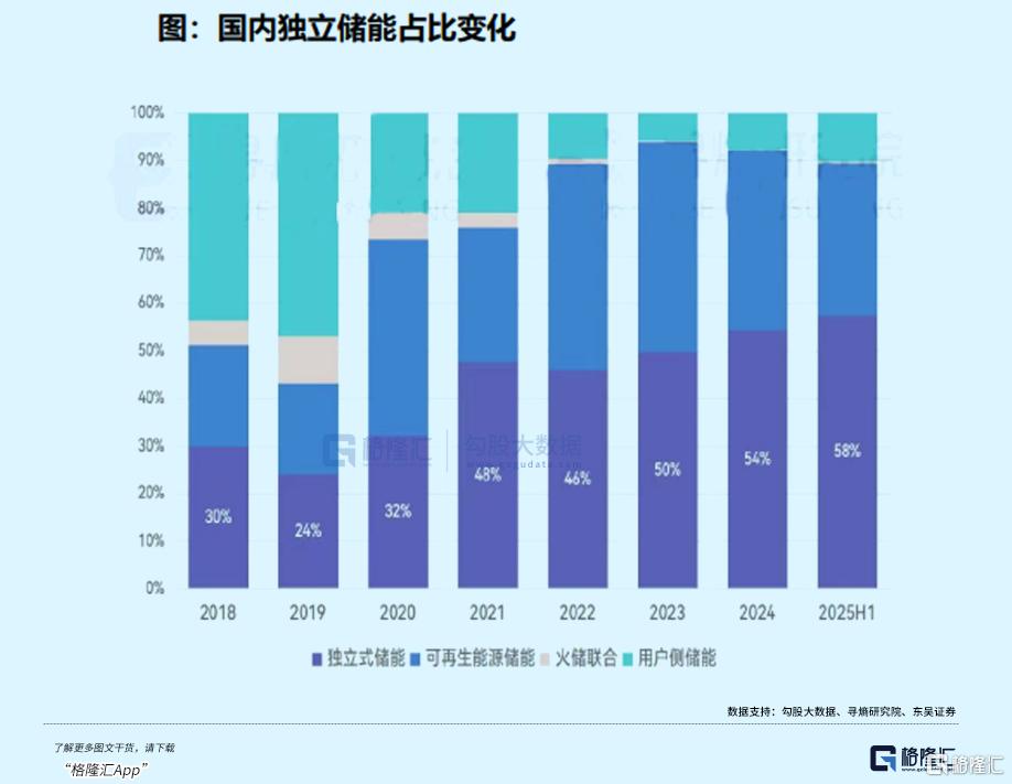 之前“强制配储”,独立式储能项目比例从2018年30%,再到2023年突破了50%,今年上半年国内独立储能占比58%,累计装机规模127GWh。