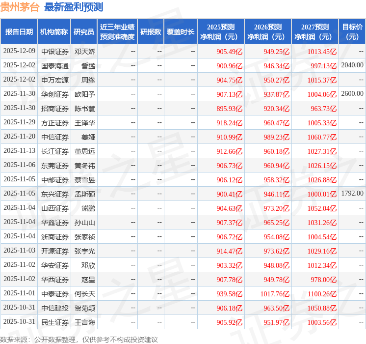 最新盈利预测明细如下: