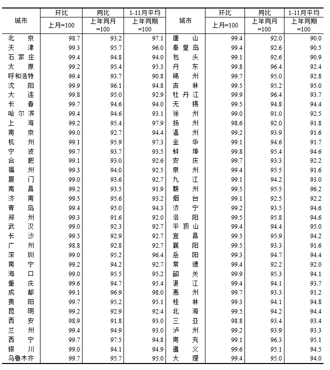 11月份,一线城市新建商品住宅销售价格同比下降1.2%,降幅比上月扩大0.4个百分点。其中,上海上涨5.1%,北京、广州和深圳分别下降2.1%、4.3%和3.7%。二、三线城市新建商品住宅销售价格同比分别下降2.2%和3.5%,降幅分别扩大0.2个和0.1个百分点。