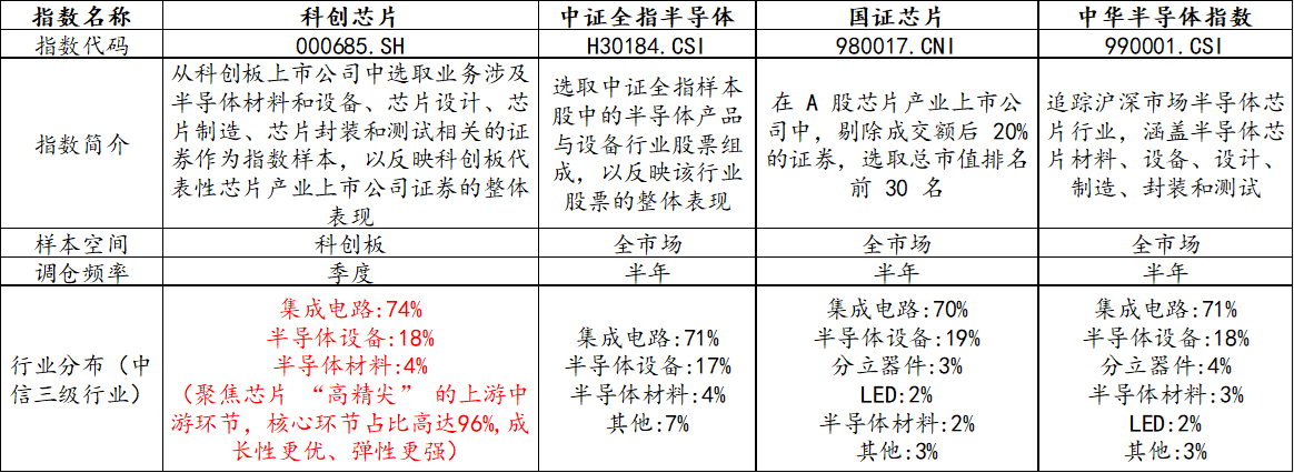 市场上芯片相关指数众多,选取当下热门的科创芯片、半导体等指数进行比较,可以发现,虽然均聚焦为芯片板块,但在指数编制上却大有不同。一句话总结:科创芯片指数聚焦芯片核心环节,“含芯量”更高,弹性强,成长性高