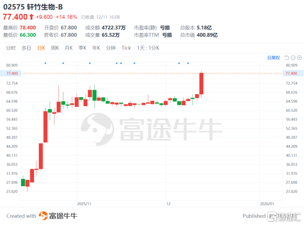 轩竹生物股价再创新高。
